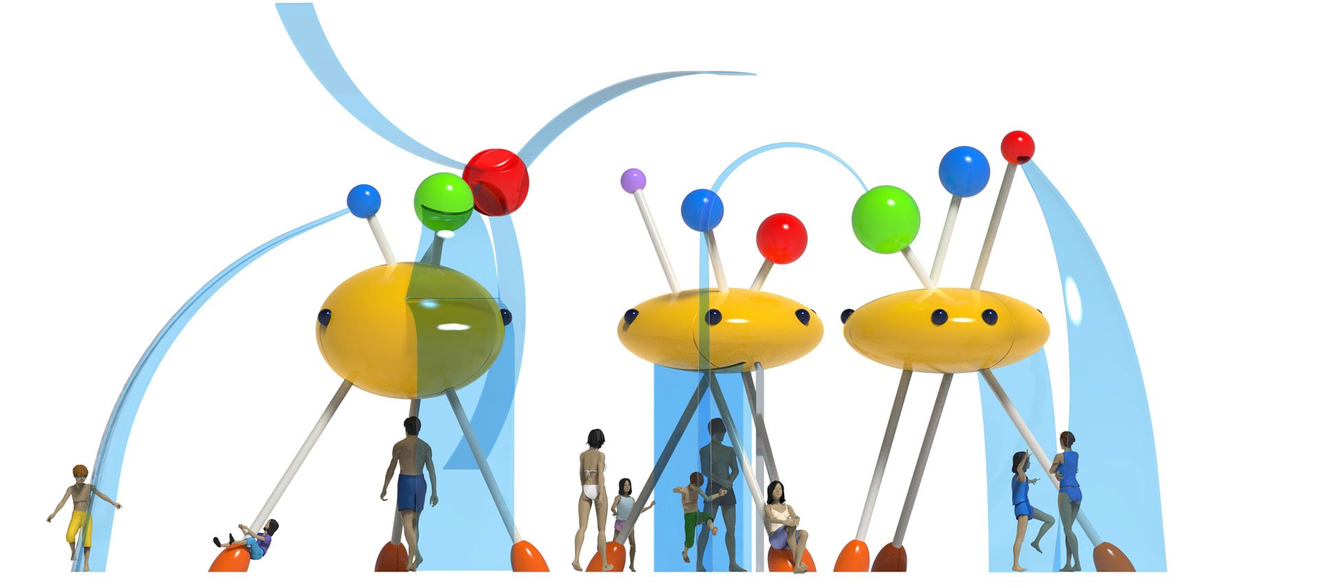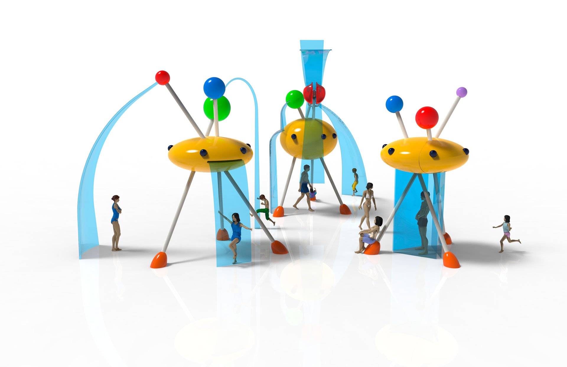 Трехногие конструкции состоят из труб из нержавеющей стали с наконечниками и верхними объемами, выполненными в 3D Tech. Опорные стойки содержат гибкие трубы для подачи воды к распределителям, расположенным в центре узлов, и, таким образом, для подачи воды на водопады, души и фонтаны. Благодаря целой палитре ярких цветов на выбор конечный результат — веселые и дружелюбные фигуры. Структура Tri-Pods предлагает множество вариантов игр: можно лазать по трубе и скатываться вниз, брызгать друг в друга, бегать вокруг, пересекать водопады. В целом эти игры подходят для любой аудитории, включая всю семью, детей и людей с ограниченными возможностями.