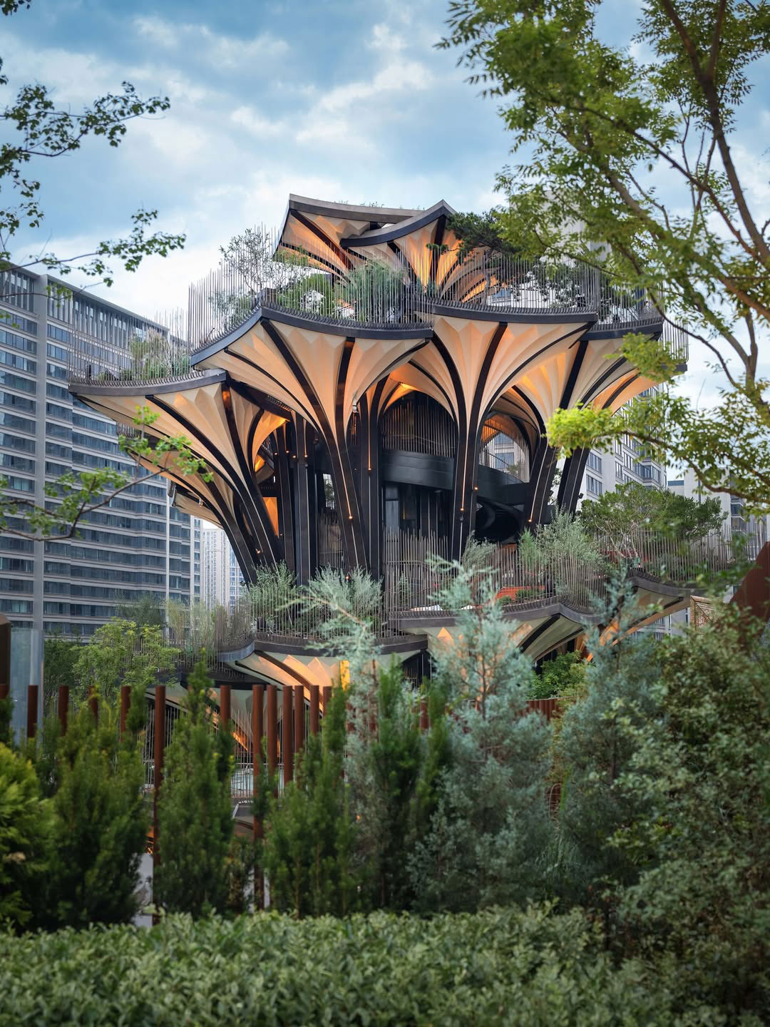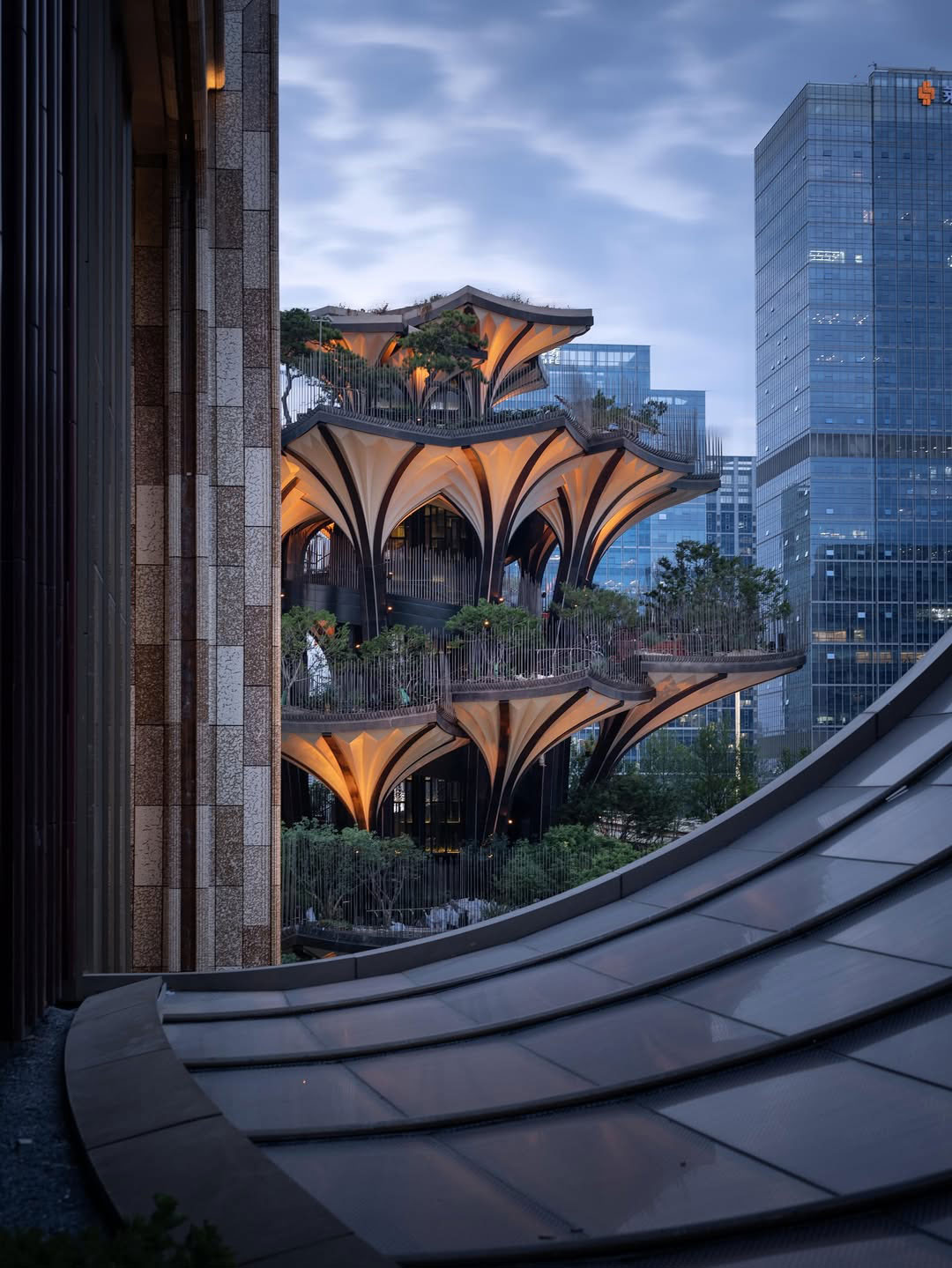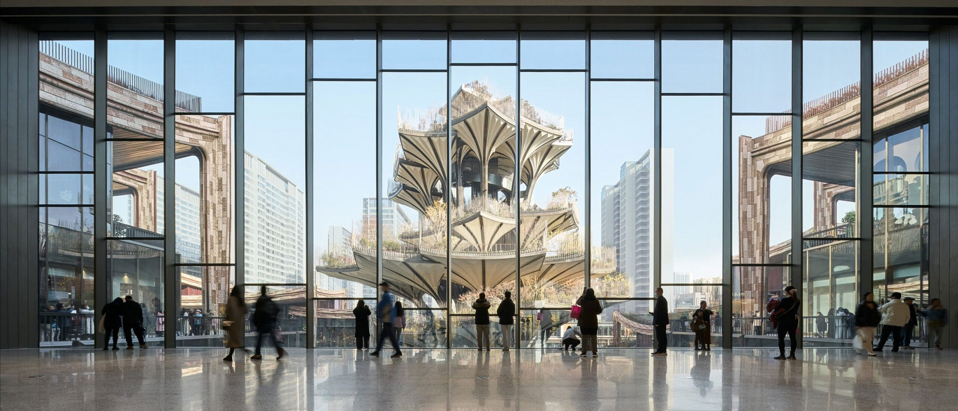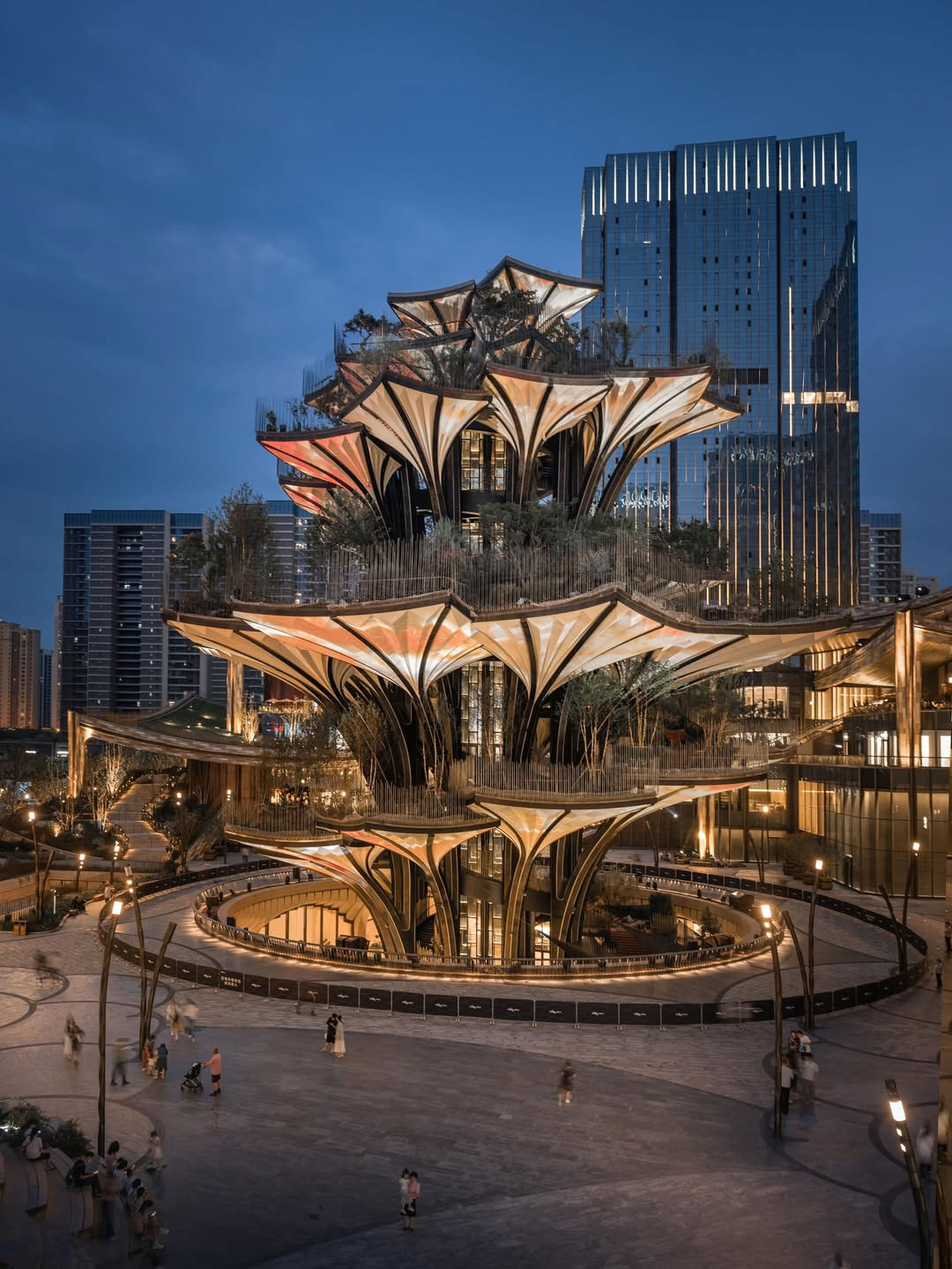Xi’an Tree – это не просто здание, а скульптурный образ, наделенный ботаническим духом. Огромное дерево с ветвями, раскрывающимися подобно рукам или, как любовно называют его архитекторы, словно «лепестки», возвышается на 57 метров от уровня фундамента, располагаясь на 56 террасах. Террасы-лепестки – это не просто смотровые площадки, а настоящие висячие сады. Они прослеживают поэтическое путешествие по биомам древнего Шелкового пути, который когда-то начинался в самом городе Сиань. Подъём на это «Сианьское дерево» становится ландшафтным паломничеством, прогулкой, которая поднимается из тундры в степь.