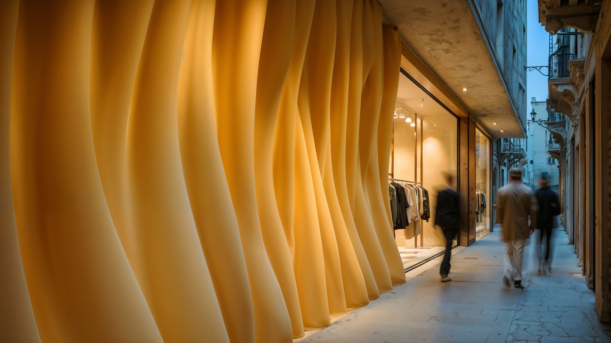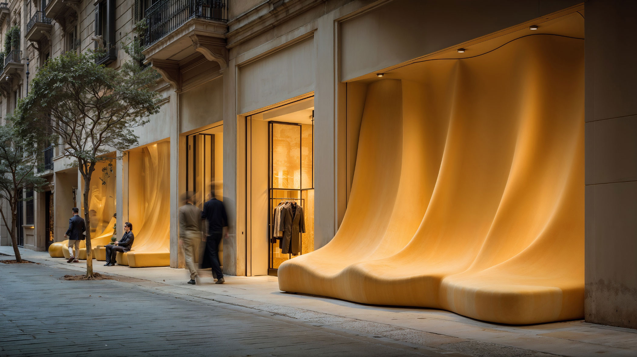 Это уже не просто «витрина». Это скульптурный элемент урбанистики, где форма служит не только эстетике, но и функции. Прохожие больше не просто смотрят — они останавливаются, садятся, играют, разговаривают. Дети забираются на плавные выступы, как на холмы; пары устраивают импровизированные свидания на каменных лавочках; туристы делают фото не только товаров, а самого фасада — как части городского пейзажа.