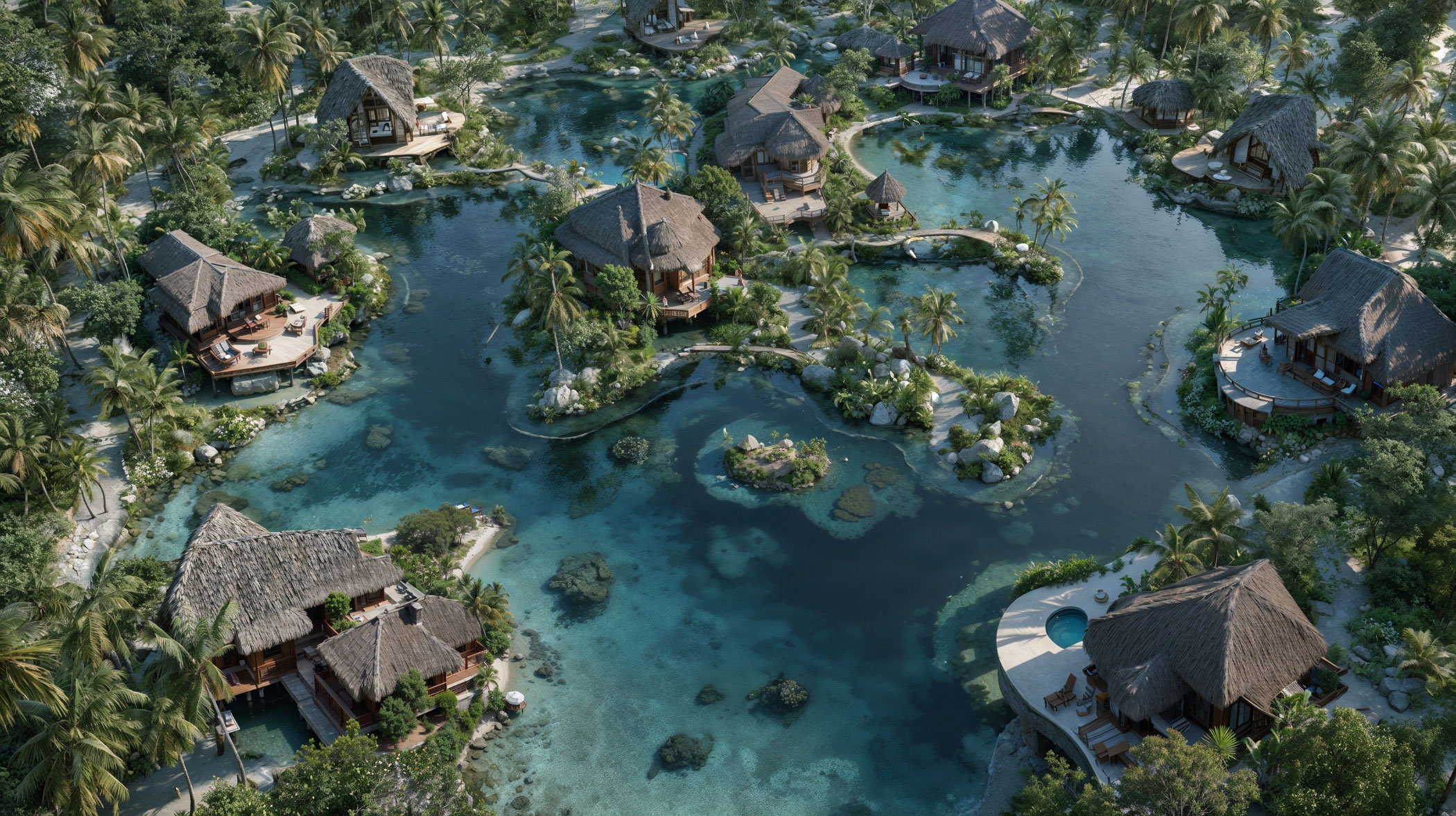 Оптимизированный дизайн воссоздает концепцию, подобную концепции курортного отеля на Мальдивах, которая работает в самых разных условиях, даже на континенте. Использование технологий климат-контроля, фильтрации воды и местной растительности позволяет сочетать это эстетическое и чувственное качество с минимальным воздействием на окружающую среду. Таким образом, данная модель является воспроизводимой и экологически устойчивой, предлагая райские ощущения независимо от географического положения.