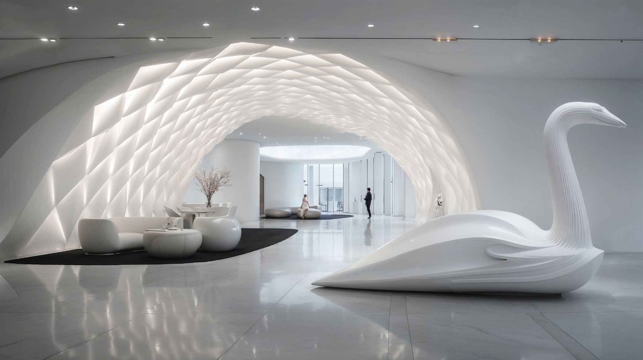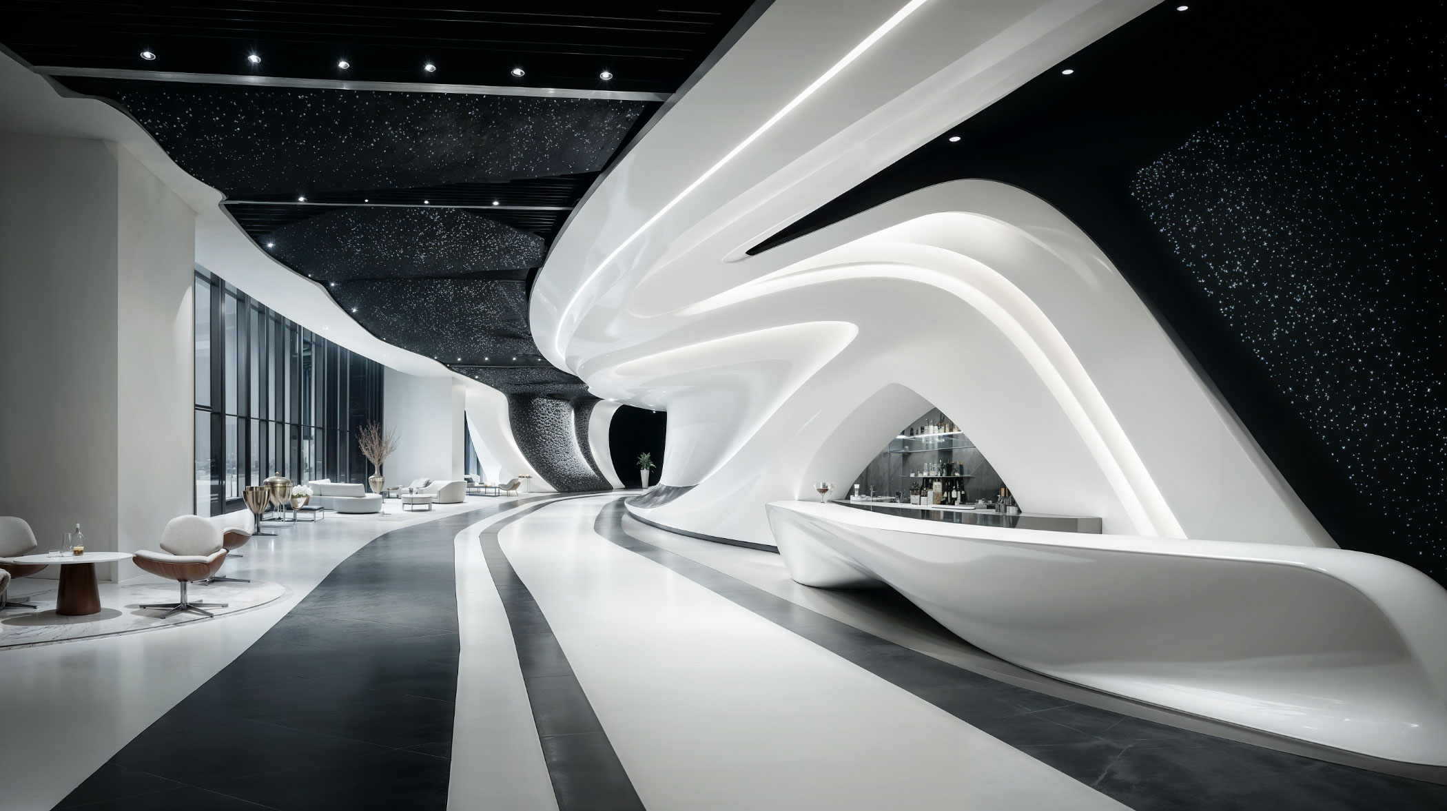 Над головой — волнообразные структуры, не просто декор, а скульптуры из света и тени, которые мягко направляют движение, не требуя указателей. Стены — не плоскости, а поверхности, приглашающие к прикосновению: лакированные, полированные, с матовой глубиной, будто выточенные из одного куска. Всё это создаёт ощущение почти неземной чистоты, где современность не кричит, а шепчет.