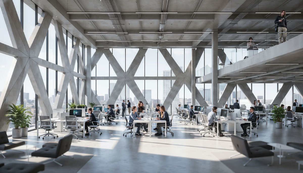 Ключевым элементом конструкции является несущий каркас, реализованный в виде внутренней решётки из стали и бетона. Эта структура освобождает фасады от несущих функций, позволяя создать лёгкую, технологически продвинутую оболочку, которая реагирует на климатические условия, а не противостоит им.