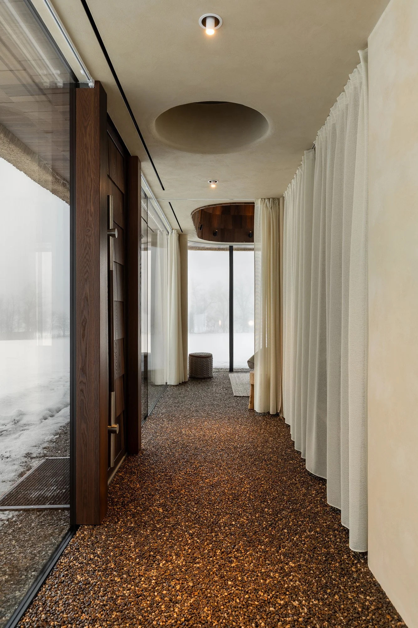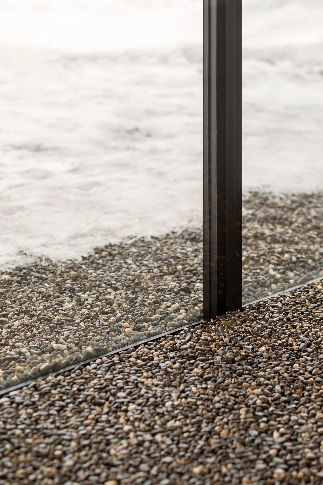 Днем крыша словно парит над ландшафтом, нависая над почти незаметными стеклянными фасадами. Пол, покрытый сплошным слоем уплотненного заполнителя — таким же, как и по внешнему периметру, — усиливает пространственную целостность. Для обеспечения приватности пространство закрывается автоматическими шторами.
