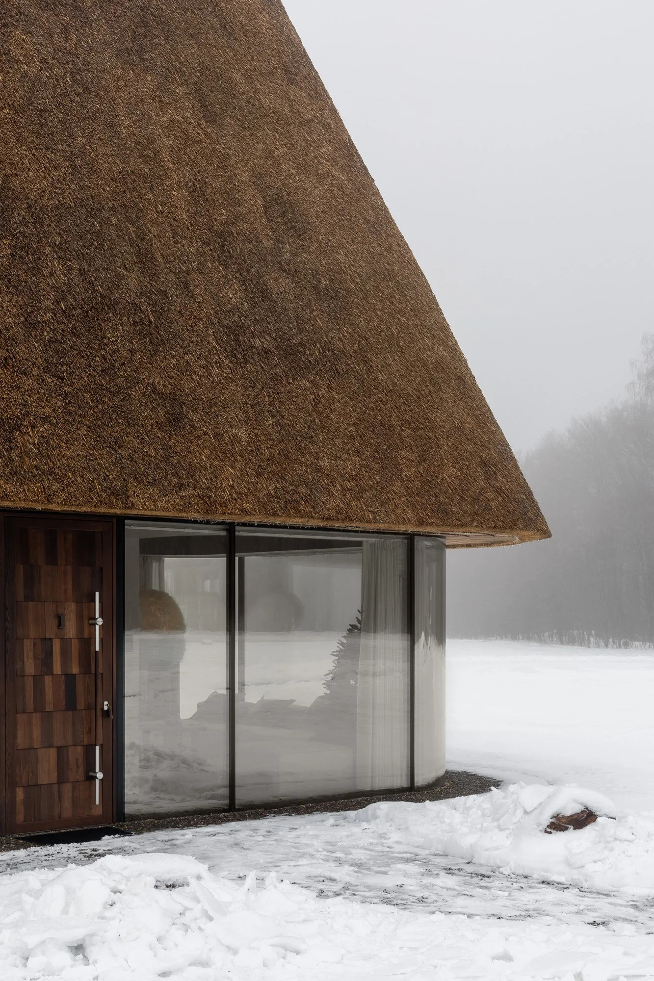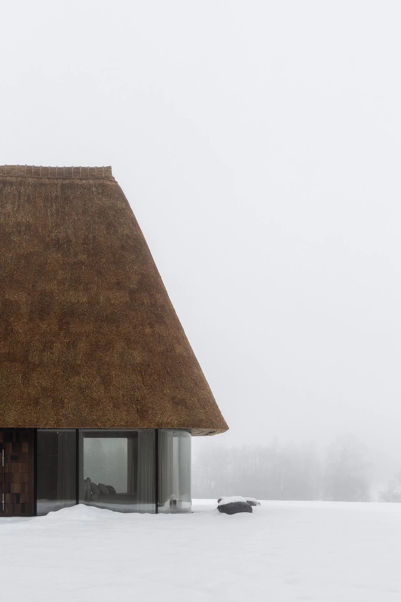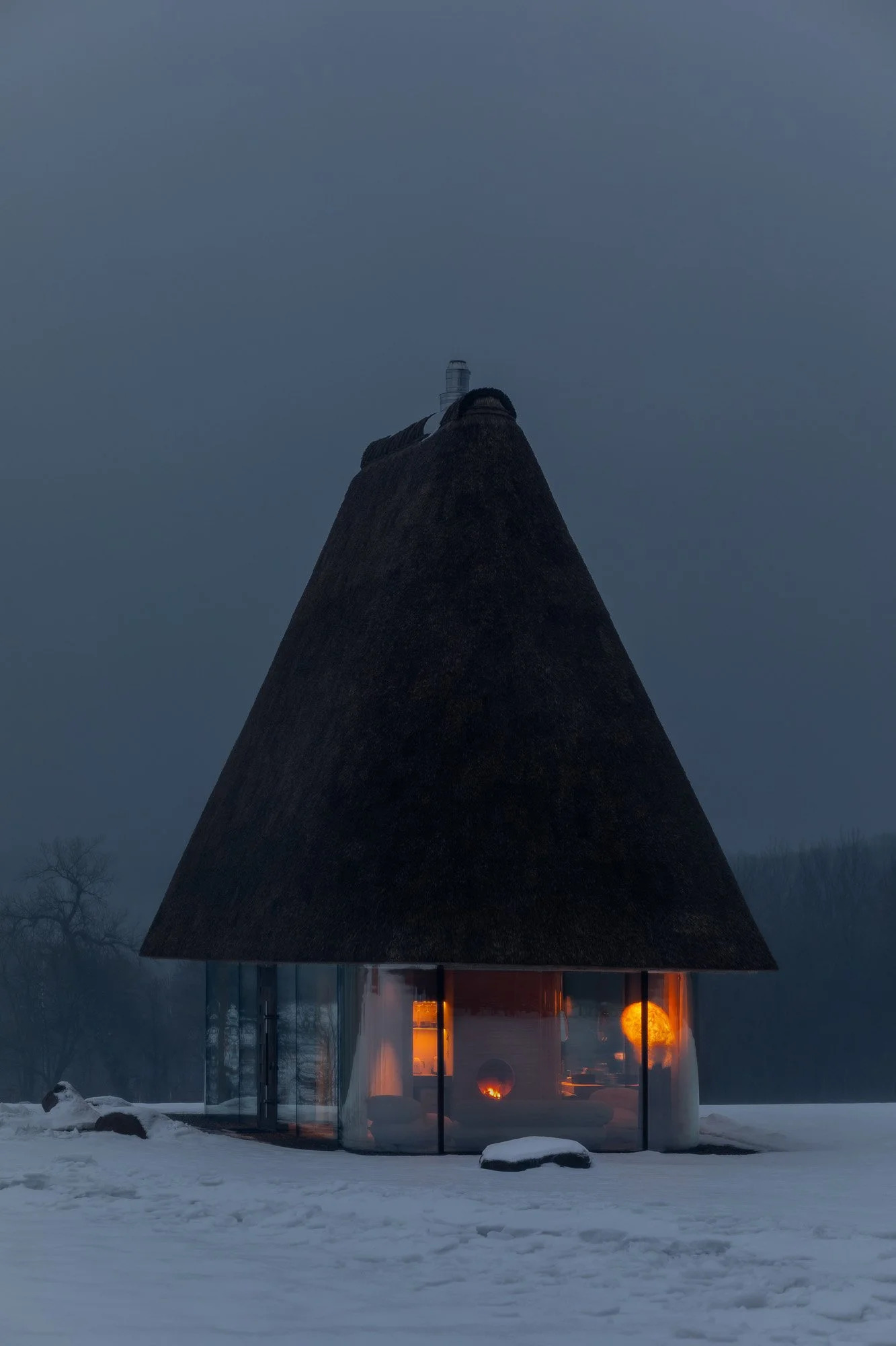 Действительно, вдохновение для этого проекта черпается в украинской народной архитектуре, в частности, в сельском жилище, известном как «мазанка». Из нее заимствованы основные черты, такие как побеленные стены, соломенная крыша и характерная планировка. Но вместо того, чтобы просто воспроизвести эти черты, команда под руководством архитектора Владимира Непийвода интерпретирует их по-своему. То, что традиционно было сплошной стеной, здесь превращается в застекленную поверхность, стремящуюся к свету и визуальной чистоте. А то, что когда-то было соломенной крышей, теперь расширяется, становясь главной особенностью проекта.